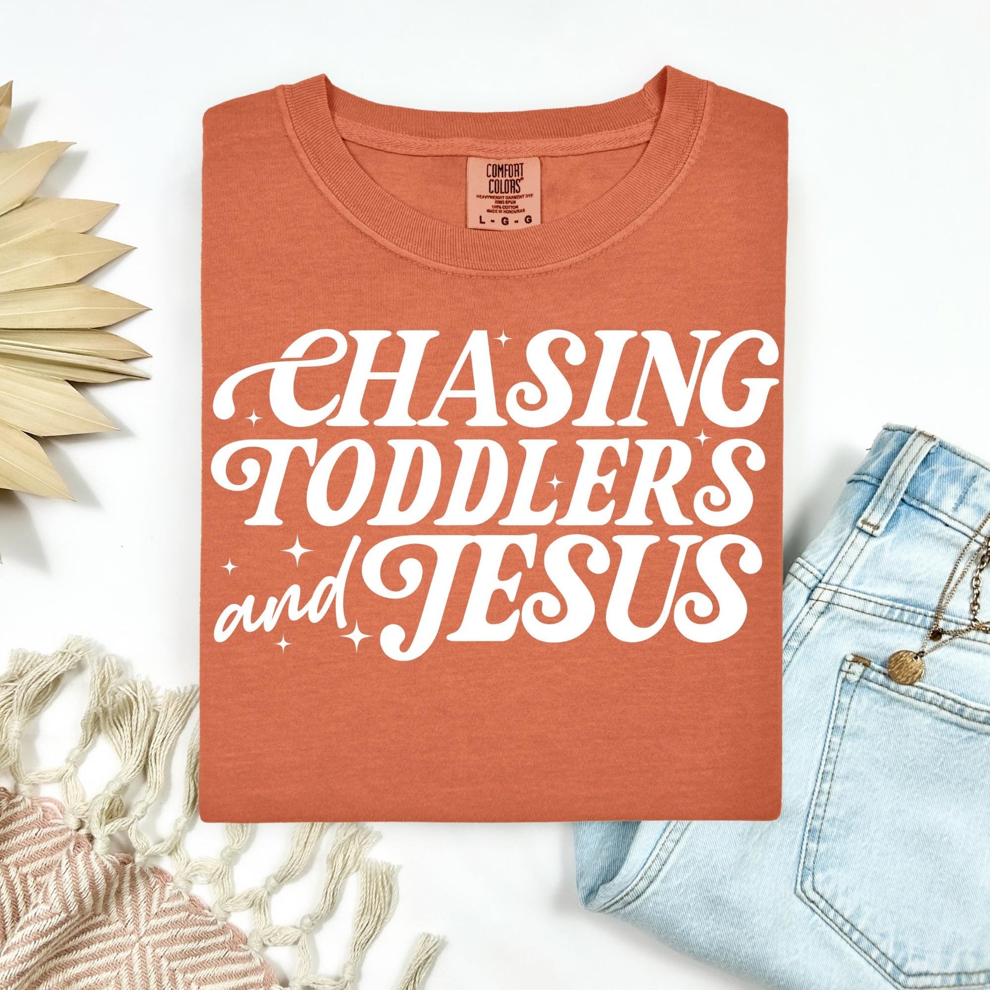Chasing Toddlers and Jesus – Comfort Colors Tee in Yam 👣✝️