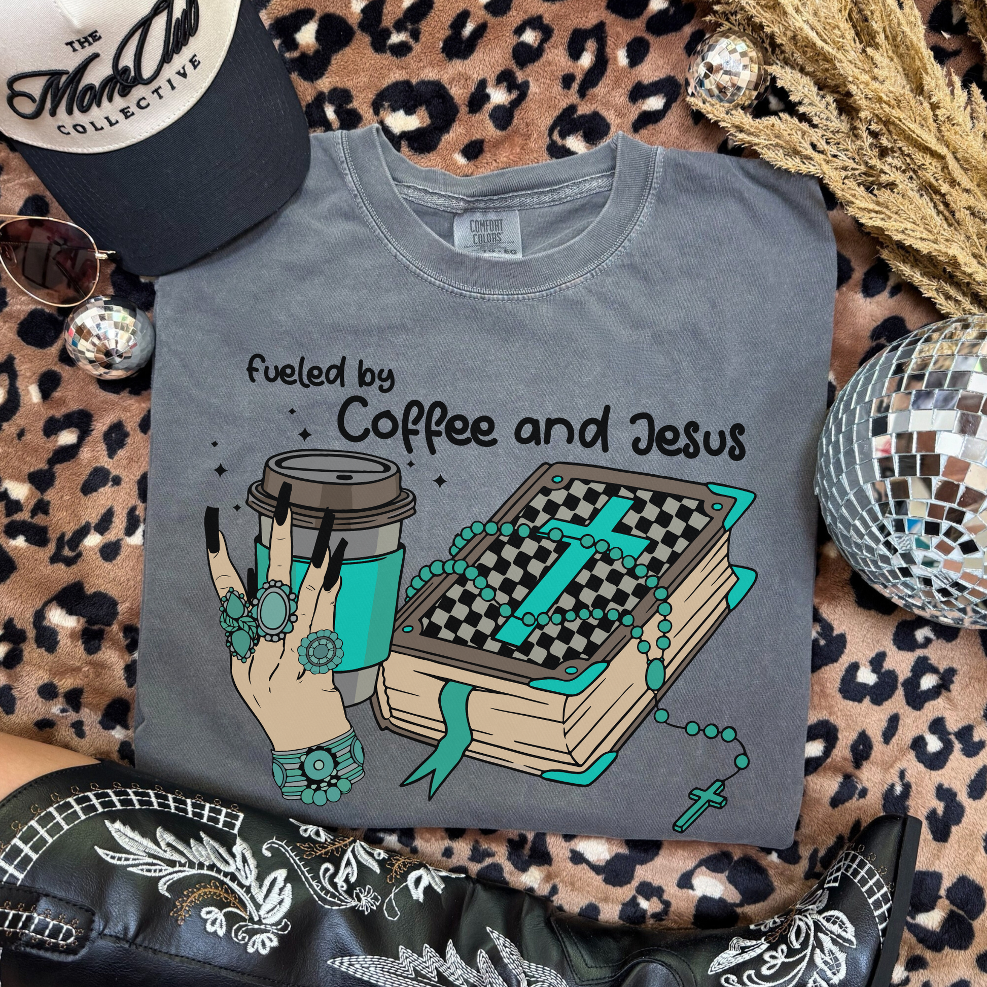 For the girls who run on caffeine and faith — this Fueled by Coffee & Jesus tee is a must-have. Featuring a turquoise-accented western graphic with a Bible, rosary, and to-go coffee cup, it perfectly blends small-town style with spiritual strength. Soft, comfy, and made to last, it’s ideal for morning coffee runs, Bible study, or everyday wear.