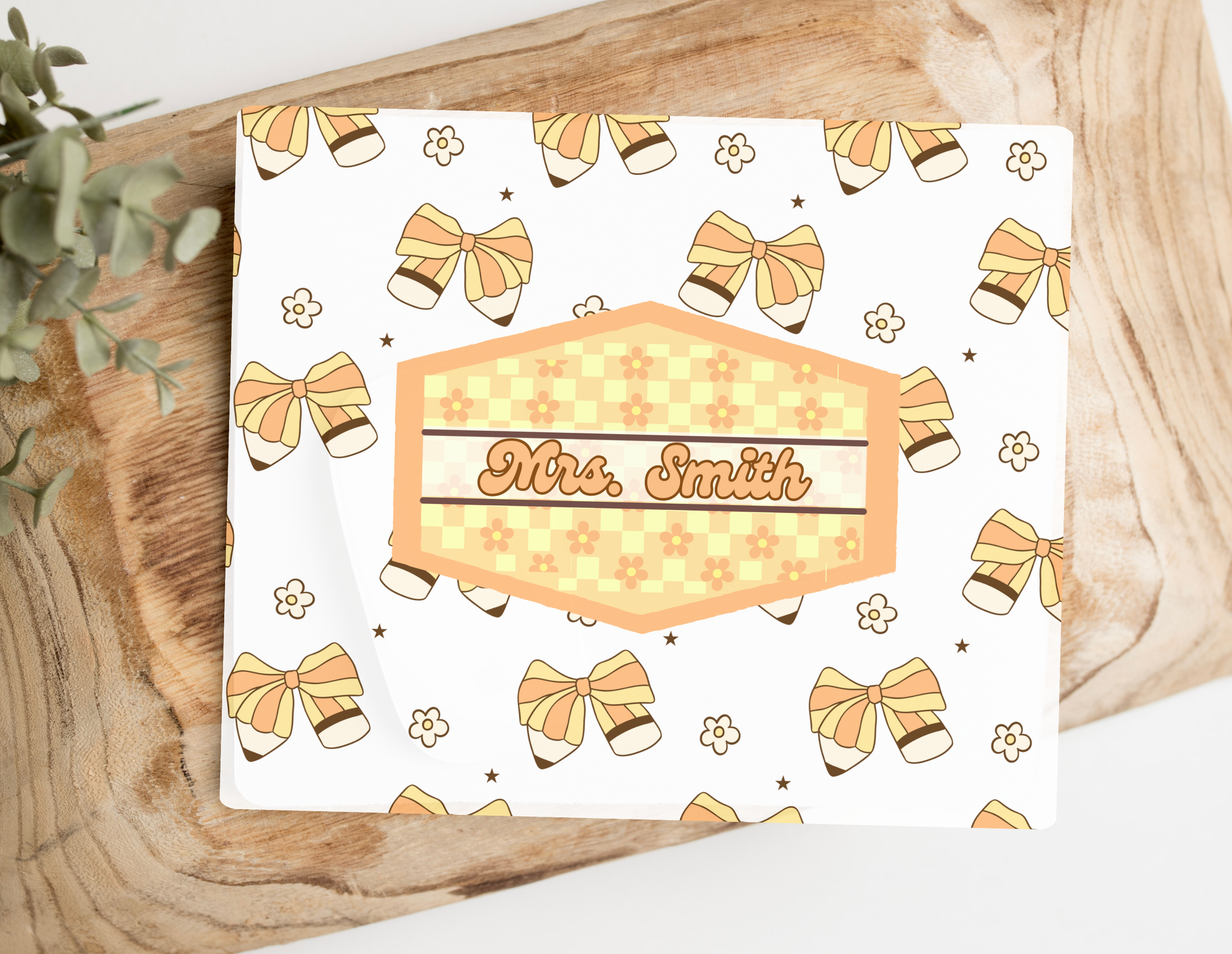 Add a touch of charm to your desk with our Golden Bows Custom Teacher Mousepad — the perfect personalized teacher gift for the classroom or home office. Featuring a soft yellow gingham-inspired center framed with golden bow and pencil accents, this mousepad blends sweet style with everyday function.