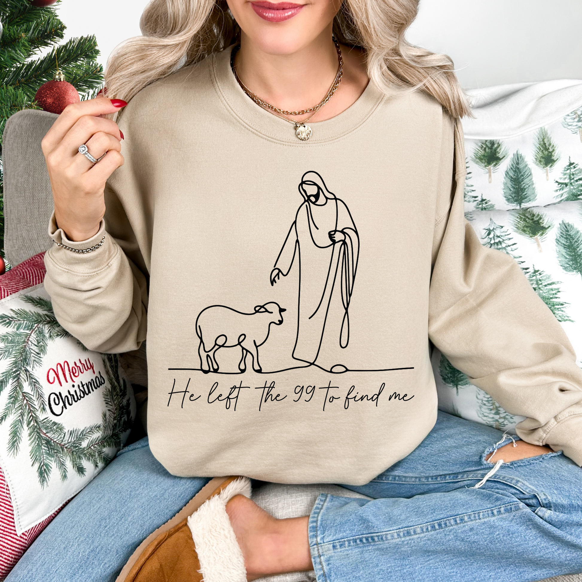 Wrap yourself in the comfort of His love with our He Left the 99 to Find Me sweatshirt. This simple yet powerful line art design captures Jesus and the lost sheep — a reminder of grace, redemption, and the Shepherd who never stops pursuing His flock.