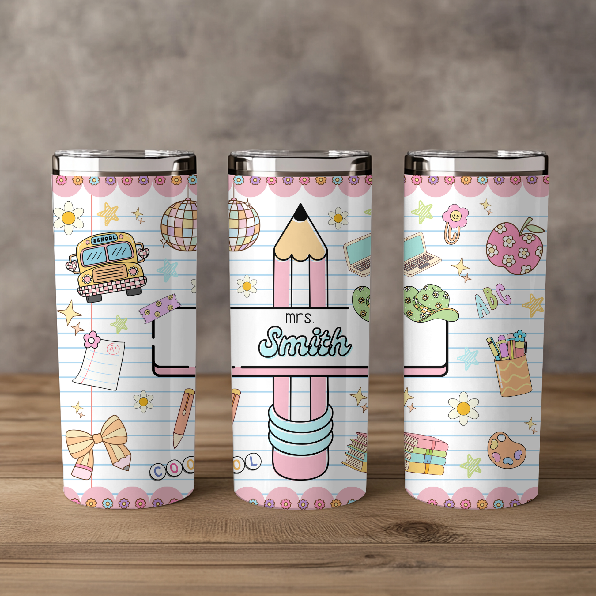 Show off your style in (and out of) the classroom with our Pencil Me In 20oz tumbler. Featuring a playful lined-paper background filled with colorful school-themed doodles—think apples, books, bows, and disco balls—this tumbler makes the perfect teacher gift or personal treat. The large pencil design front and center includes space for your name, making it uniquely yours.